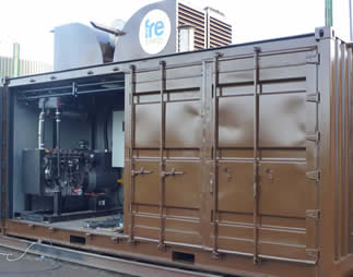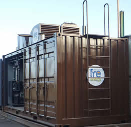 Each container is designed to hold up to 3 x 80 kWh CHP biogas engines; each CHP is a self-contained “Plug & Play” unit mounted on its own frame so that it can be removed using pallet forks. An access door opposite each engine aids easy access for maintenance and replacement.